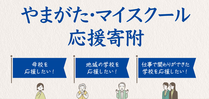 「やまがた・マイスクール応援寄附」は、山形市の公立小中学校を指定して寄附することのできる制度です。 学校卒業生や企業など、「母校やゆかりのある学校を応援したい」という気持ちを寄附という形で実現できます。 ご指定いただいた学校では、寄附金を教育環境の充実や特色ある学校づくりのために活用し、こども達の学びや成長を力強くサポートします。